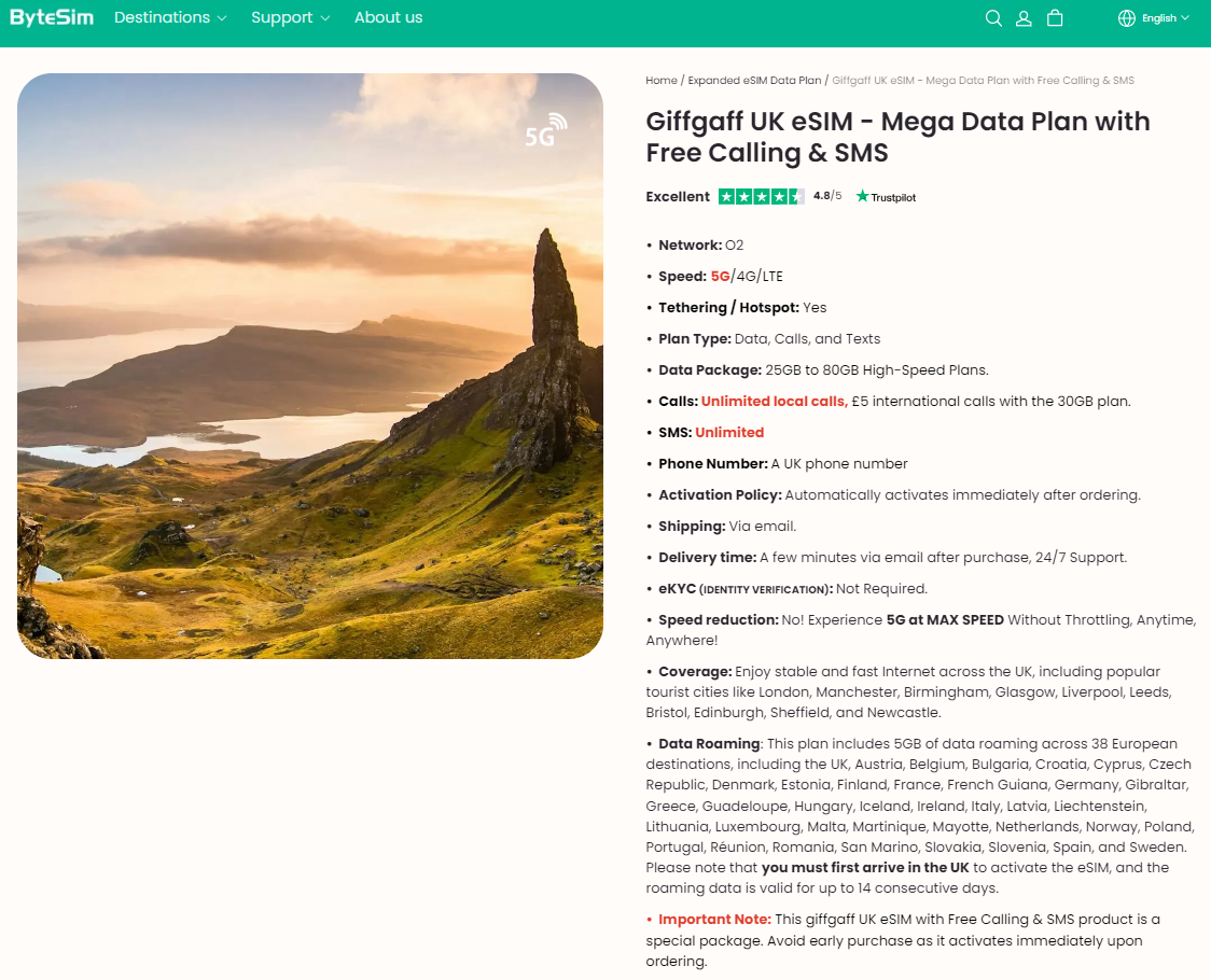 The ByteSIM Giffgaff eSIM for the UK provides all the essentials for staying connected, offering high-speed data access and unlimited UK calls with favorable price. It also supports data sharing. While most devices can share data, we cannot guarantee compatibility with all devices.