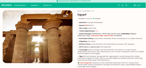 Travelers also appreciate ByteSIM’s 24/7 multilingual customer support via email or WhatsApp. If you encounter any connection issues while exploring Egypt, help is always just a message away. Whether you're sightseeing in the Pyramids of Giza or relaxing on the Red Sea beaches, ByteSIM provides competitive rates and reliable coverage, giving you peace of mind throughout your trip.