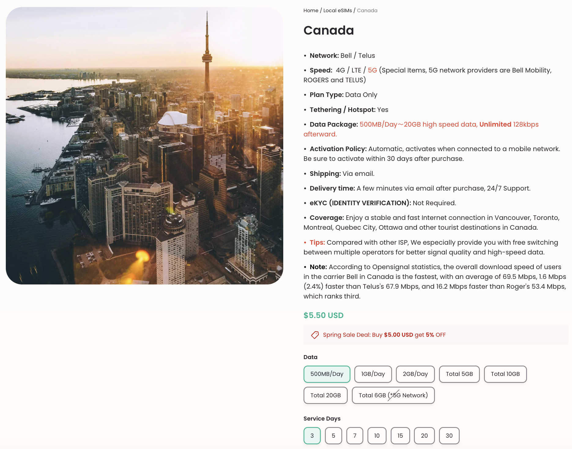 上記の国および地域の通信事業者に加えて、カナダの eSIM ニーズに対応するもう 1 つの注目すべきオプションが ByteSIM です。 ByteSIMはBellとTelusのネットワークを利用し、全国で信頼できるカバレッジを保証します。データ制限を気にせずに接続を維持できる、魅力的な無制限のデータ プランを提供しています。 ByteSIM を使用すると、シームレスな接続を享受し、高速 5G ネットワークを活用して、旅行中に高速で信頼性の高いインターネット アクセスを確保できます。